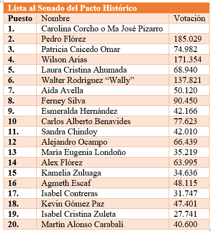 Y finalmente, también se sitúan con fuerza las representaciones de la izquierda política comprometida con el proyecto del cambio. Esta conclusión se demuestra con los casos de Wilson Arias que alcanzó 171 mil votos y Alberto Benavides con 77 mil votos, ambos del Polo; Ferney Silva de Colombia Humana con 90 mil votos; Aída Avella de la Unión Patriótica con 50 mil votos, y María Eugenia Londoño del Partido Comunista con 35 mil votos.
